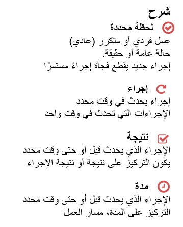 يتم توزيع أزمنة الفعل على محور زمني (الماضي والحاضر والمستقبل) ويتم تجميعها وفقًا لجوانبها المختلفة.