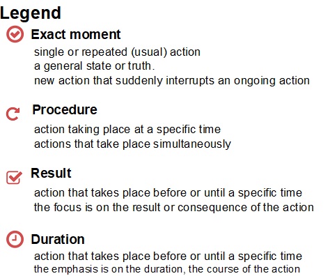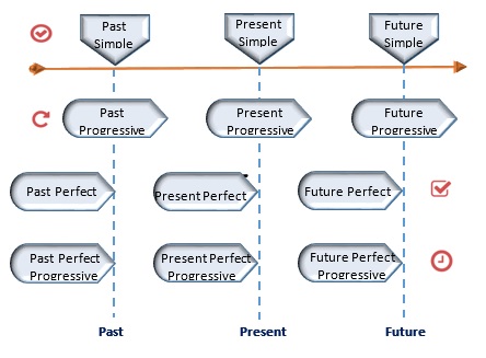 The verb tenses are distributed on a temporal axis (past, present and future) and are grouped according to their different aspects.