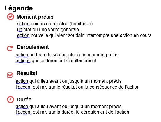 Les temps verbaux sont répartis sur un axe temporel (passé, présent et futur) et sont regroupés selon leurs différents aspects.