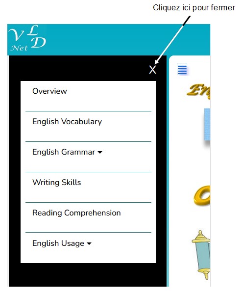 • Parts of Sentence • Tense • Additional Grammar Affichage sur un PC (DESKTOP) :![]() Affichage sur un Smartphone :![]() 4.2.4 L’onglet Writing Skills.4.2.5 L’onglet Reading Comprehesion.4.2.6 L’onglet English Usages.5. Exemple de contenu de page selon la langue choisie.![]() Langue d’affichage : Vous pouvez modifier la langue d'affichage à tout moment. Pour ce faire, cliquez sur l'un des drapeaux dans le coin supérieur droit pour changer la langue. ![]() Pour vous déconnecter de la page affichée, cliquez sur la croix à droite de la page.
