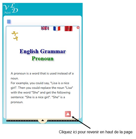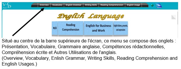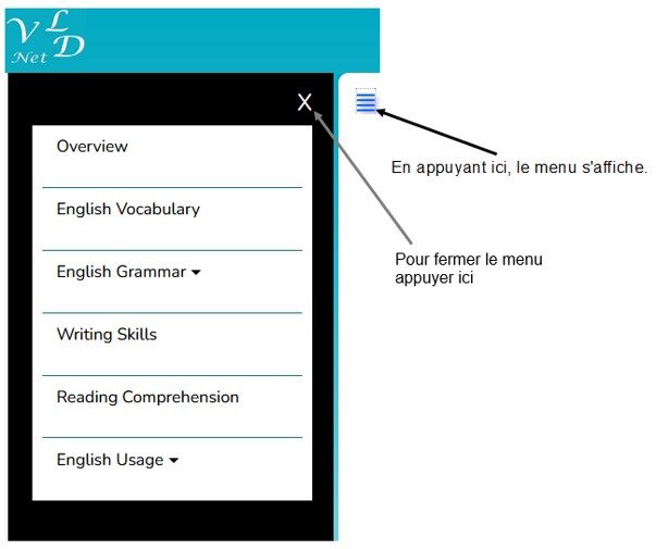 ![]() 1. Introduction.Site de formation d'Anglais en trois langues (l’Anglais, le Français et l’Arabe). Ce site permet d’apprendre le vocabulaire de base : assimiler et savoir utiliser de nouveaux mots et expressions fréquemment utilisées. Comprendre la grammaire anglaise : acquérir les règles de base de la syntaxe et de la conjugaison, en utilisant trois langues « l’Anglais, le Français et l’Arabe ». ![]() ![]() ![]() Dans ce guide d’utilisation, vous trouverez la plupart des informations nécessaires pour vous familiariser avec le site de formation de l'Anglais. 2. Accès au site web de formation de l’anglais.Vous devez accéder au site web de formation de l’anglais via la page Web https://www.netservicevld.com/english/. 3. Interfaces des pages affichées.Une fois connecté, vous serez redirigé vers la page Overview, qui fournit un aperçu général du site. Les interfaces du site ont un affichage différent selon la connexion sur un PC, une tablette ou un smartphone. 3.1 Sur un PC (A desktop computer / Ordinateur de bureau / Ordinateur portable).![]() 3.2 Sur un Smartphone.![]() 4.1 Menus dans le site.4.1.1 Sur un PC (A desktop).![]() 4.1.2 Sur un Smartphone.![]() 4.2.1 L’onglet Overview.![]() La page Overview permet d'afficher un extrait des différentes thématiques. Tous les éléments de cette page sont cliquables, vous permettant d'afficher un aperçu général. Dans chaque aperçu, d'autres éléments relatifs au contenu sont présentés et peuvent également être cliqués pour y accéder directement. Exemples : L’aperçu Vocabulary : ![]()