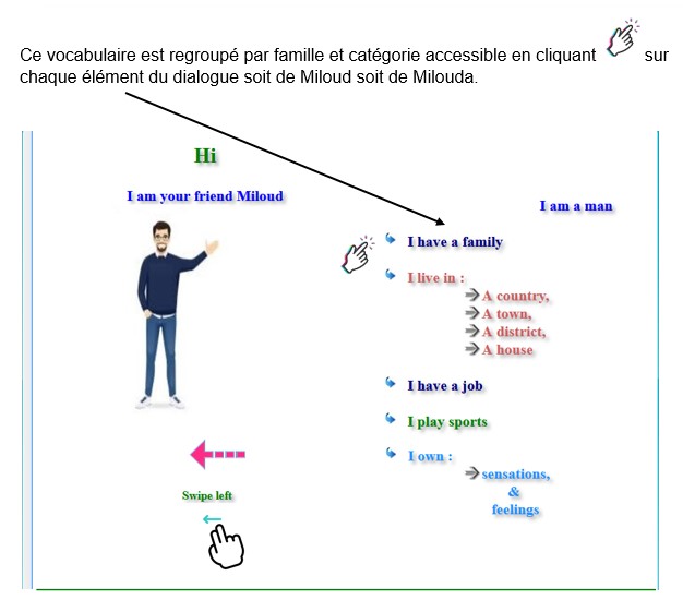 L’aperçu Parts of Speech : ![]() ![]() ![]() Chaque élément présenté ici est cliquable permettant la redirection vers la page du contenu concerné. L’aperçu Parts of Sentence : ![]() En cliquant sur un élément relatif à un thème vous accédez directement au contenu. 4.2.2 L’onglet English Vocabulary.![]() Le vocabulaire est la clé de votre réussite Le vocabulaire est une composante essentielle du langage et de la communication, aidant à transmettre des pensées, des idées, des émotions et des informations. Vous trouverez dans ce site de formation un certain vocabulaire nécessaire à la communication utilisé par les deux personnages Miloud et Milouda qui nous le présentent en images avec prononciation.